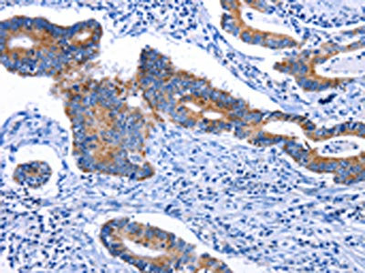 The image on the left is immunohistochemistry of paraffin-embedded Human colon cancer tissue using CSB-PA554957(STAT5A Antibody) at dilution 1/25, on the right is treated with fusion protein. (Original magnification: ×200)