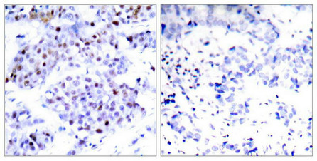 Immunohistochemical analysis of paraffin-embedded human breast carcinoma tissue using STAT6(Ab-645) Antibody(left) or the same antibody preincubated with blocking peptide(right).