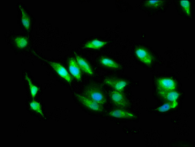 Immunofluorescence staining of Hela cells with CSB-PA00249A0Rb at 1:100, counter-stained with DAPI. The cells were fixed in 4% formaldehyde, permeabilized using 0.2% Triton X-100 and blocked in 10% normal Goat Serum. The cells were then incubated with the antibody overnight at 4°C. The secondary antibody was Alexa Fluor 488-congugated AffiniPure Goat Anti-Rabbit IgG(H+L).