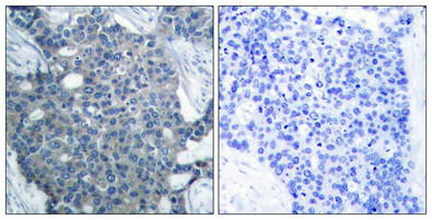 Immunohistochemical analysis of paraffin-embedded human breast carcinoma tissue using Stathmin 1(Ab-25) Antibody(left) or the same antibody preincubated with blocking peptide(right).