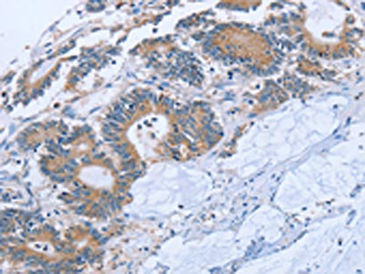The image on the left is immunohistochemistry of paraffin-embedded Human colon cancer tissue using CSB-PA147125(STMN1 Antibody) at dilution 1/20, on the right is treated with synthetic peptide. (Original magnification: ×200)