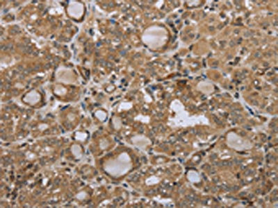 The image on the left is immunohistochemistry of paraffin-embedded Human thyroid cancer tissue using CSB-PA034680(STMN2/STMN3/STMN4 Antibody) at dilution 1/45, on the right is treated with synthetic peptide. (Original magnification: ×200)