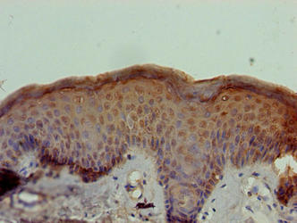 Immunohistochemistry of paraffin-embedded human skin tissue using CSB-PA765089LA01HU at dilution of 1:100