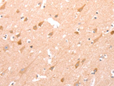 The image on the left is immunohistochemistry of paraffin-embedded Human brain tissue using CSB-PA549056(STRA8 Antibody) at dilution 1/25, on the right is treated with synthetic peptide. (Original magnification: ×200)