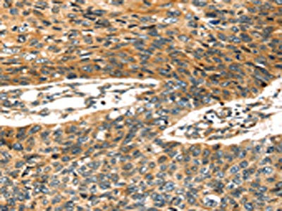The image on the left is immunohistochemistry of paraffin-embedded Human esophagus cancer tissue using CSB-PA745288(STX19 Antibody) at dilution 1/35, on the right is treated with fusion protein. (Original magnification: ×200)