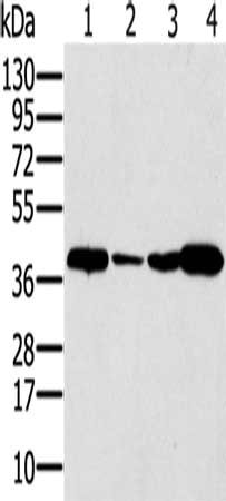 Gel: 12%SDS-PAGE, Lysate: 40 μg, Lane 1-4: Human testis tissue, Human seminoma tissue, Jurkat cells, human liver cancer tissue, Primary antibody: CSB-PA729972(SYCP3 Antibody) at dilution 1/200, Secondary antibody: Goat anti rabbit IgG at 1/8000 dilution, Exposure time: 40 seconds