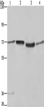 Gel: 6%SDS-PAGE, Lysate: 40 μg, Lane 1-4: A375 cells, 231 cells, 293T cells, human hepatocellular carcinoma tissue, Primary antibody: CSB-PA285442(SYN1 Antibody) at dilution 1/550, Secondary antibody: Goat anti rabbit IgG at 1/8000 dilution, Exposure time: 40 seconds