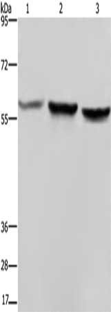 Gel: 6%SDS-PAGE, Lysate: 40 μg, Lane 1-3: Hela cells, A375 cells, LoVo cells, Primary antibody: CSB-PA557600(SYN2 Antibody) at dilution 1/1400, Secondary antibody: Goat anti rabbit IgG at 1/8000 dilution, Exposure time: 40 seconds