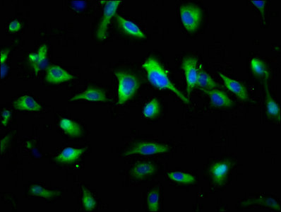 Immunofluorescence staining of U251 cells with CSB-PA023023LA01HU at 1:145, counter-stained with DAPI. The cells were fixed in 4% formaldehyde, permeabilized using 0.2% Triton X-100 and blocked in 10% normal Goat Serum. The cells were then incubated with the antibody overnight at 4°C. The secondary antibody was Alexa Fluor 488-congugated AffiniPure Goat Anti-Rabbit IgG(H+L).