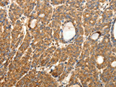 The image on the left is immunohistochemistry of paraffin-embedded Human thyroid cancer tissue using CSB-PA097385(SYT11 Antibody) at dilution 1/30, on the right is treated with fusion protein. (Original magnification: ×200)