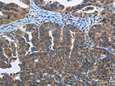 The image on the left is immunohistochemistry of paraffin-embedded Human ovarian cancer tissue using CSB-PA999782(SYT3 Antibody) at dilution 1/40, on the right is treated with fusion protein. (Original magnification: ×200)