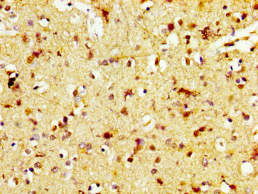 IHC image of CSB-PA023057LA01HU diluted at 1:600 and staining in paraffin-embedded human brain tissue performed on a Leica BondTM system. After dewaxing and hydration, antigen retrieval was mediated by high pressure in a citrate buffer (pH 6.0). Section was blocked with 10% normal goat serum 30min at RT. Then primary antibody (1% BSA) was incubated at 4°C overnight. The primary is detected by a biotinylated secondary antibody and visualized using an HRP conjugated SP system.