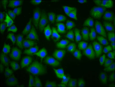 Immunofluorescence staining of Hela cells with CSB-PA023057LA01HU at 1:200, counter-stained with DAPI. The cells were fixed in 4% formaldehyde, permeabilized using 0.2% Triton X-100 and blocked in 10% normal Goat Serum. The cells were then incubated with the antibody overnight at 4°C. The secondary antibody was Alexa Fluor 488-congugated AffiniPure Goat Anti-Rabbit IgG(H+L).