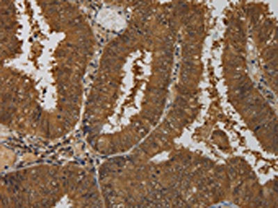 The image on the left is immunohistochemistry of paraffin-embedded Human colon cancer tissue using CSB-PA269153(TAB1 Antibody) at dilution 1/50, on the right is treated with fusion protein. (Original magnification: ×200)
