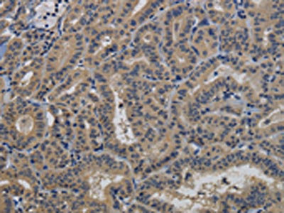 The image on the left is immunohistochemistry of paraffin-embedded Human thyroid cancer tissue using CSB-PA958657(TAB1 Antibody) at dilution 1/40, on the right is treated with fusion protein. (Original magnification: ×200)