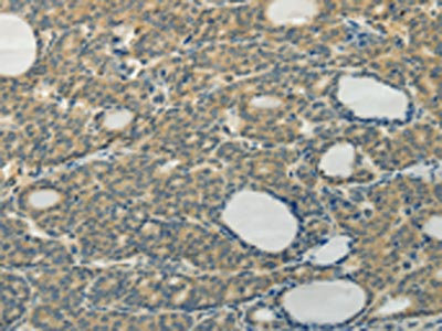 The image on the left is immunohistochemistry of paraffin-embedded Human thyroid cancer tissue using CSB-PA121037(TAGLN2 Antibody) at dilution 1/40, on the right is treated with fusion protein. (Original magnification: ×200)