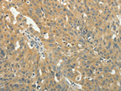 The image on the left is immunohistochemistry of paraffin-embedded Human ovarian cancer tissue using CSB-PA121037(TAGLN2 Antibody) at dilution 1/40, on the right is treated with fusion protein. (Original magnification: ×200)