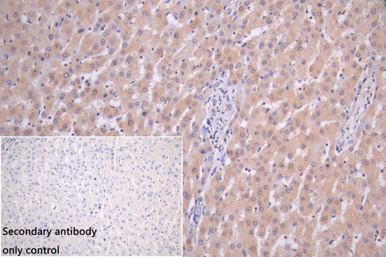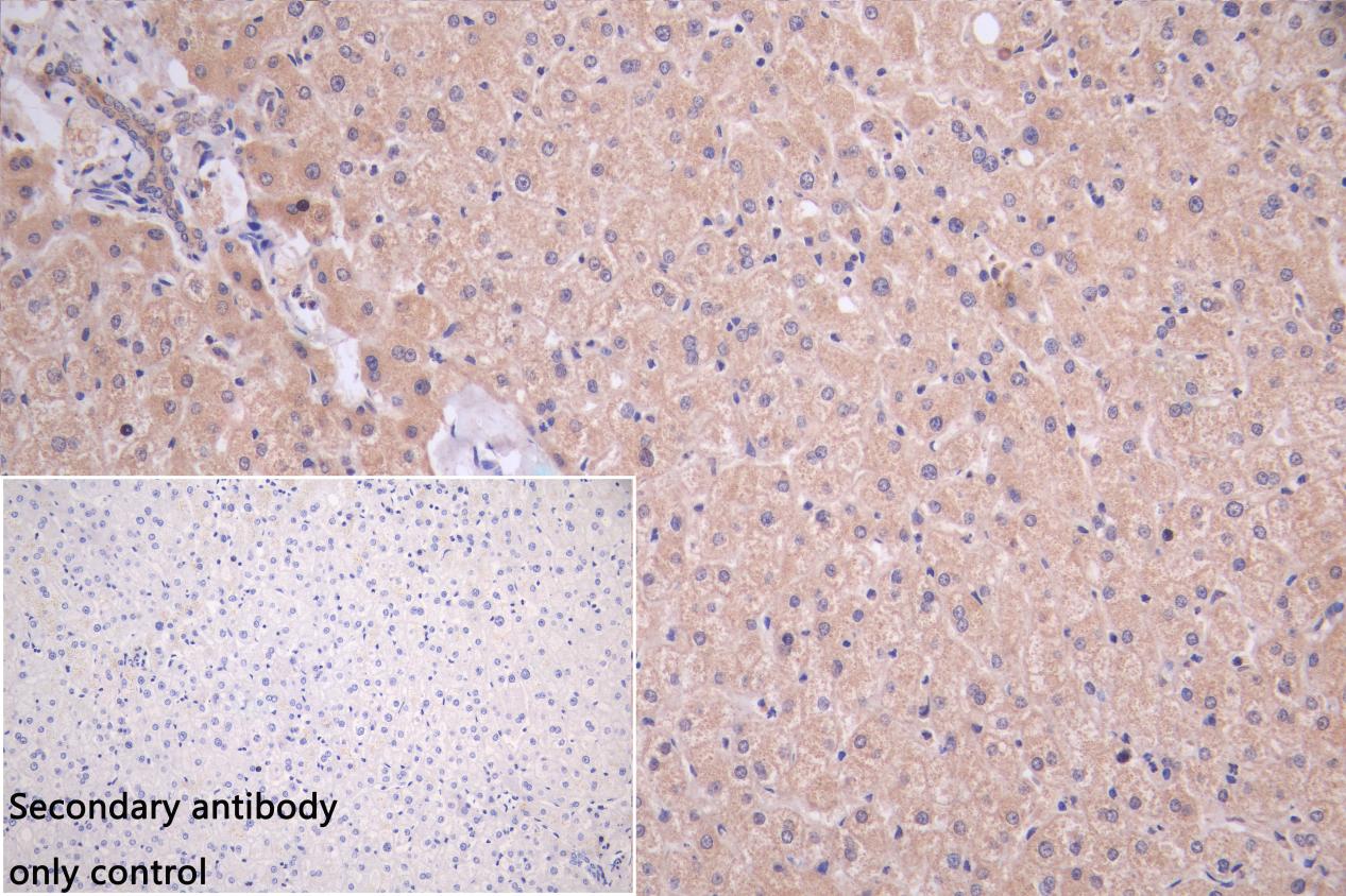IHC image of CSB-PA023175LA01HU diluted at 1:100 and staining in paraffin-embedded human liver tissue performed on a Leica BondTM system. After dewaxing and hydration, antigen retrieval was mediated by high pressure in a citrate buffer (pH 6.0). Section was blocked with 10% normal goat serum 30min at RT. Then primary antibody (1% BSA) was incubated at 4°C overnight. The primary is detected by a Goat anti-rabbit polymer IgG labeled by HRP and visualized using 0.05% DAB. Secondary antibody only control: uses 1% BSA instead of primary antibody