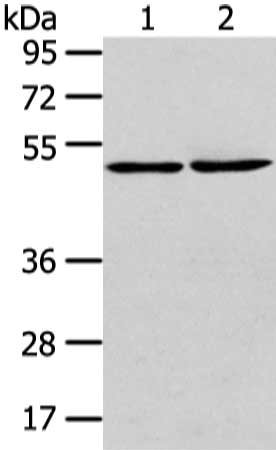 Gel: 8%SDS-PAGE, Lysate: 40 μg, Lane 1-2: A431 cell and human lung cancer tissue, Primary antibody: CSB-PA945697(TBC1D22A Antibody) at dilution 1/300 dilution, Secondary antibody: Goat anti rabbit IgG at 1/8000 dilution, Exposure time: 1 minute