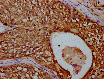 IHC image of CSB-PA883599LA01HU diluted at 1:300 and staining in paraffin-embedded human cervical cancer performed on a Leica BondTM system. After dewaxing and hydration, antigen retrieval was mediated by high pressure in a citrate buffer (pH 6.0). Section was blocked with 10% normal goat serum 30min at RT. Then primary antibody (1% BSA) was incubated at 4°C overnight. The primary is detected by a biotinylated secondary antibody and visualized using an HRP conjugated SP system.