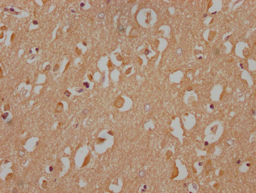 IHC image of CSB-PA890690NA172nphHU diluted at 1:100 and staining in paraffin-embedded human brain tissue performed on a Leica BondTM system. After dewaxing and hydration, antigen retrieval was mediated by high pressure in a citrate buffer (pH 6.0). Section was blocked with 10% normal goat serum 30min at RT. Then primary antibody (1% BSA) was incubated at 4°C overnight. The primary is detected by a Goat anti-rabbit IgG labeled by HRP and visualized using 0.05% DAB.