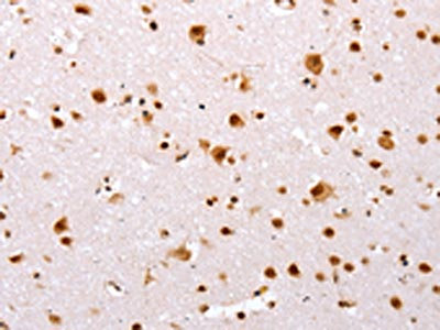 The image on the left is immunohistochemistry of paraffin-embedded Human brain tissue using CSB-PA695081(TBX2 Antibody) at dilution 1/32, on the right is treated with synthetic peptide. (Original magnification: ×200)