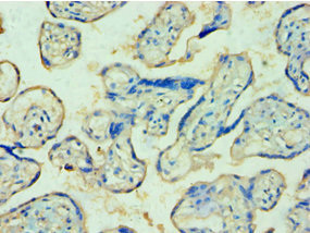 Immunohistochemistry of paraffin-embedded human placenta tissue using CSB-PA023352ESR1HU at dilution of 1:100