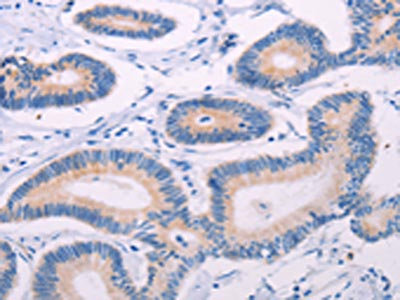 The image on the left is immunohistochemistry of paraffin-embedded Human colon cancer tissue using CSB-PA108827(TEKT4 Antibody) at dilution 1/20, on the right is treated with fusion protein. (Original magnification: ×200)