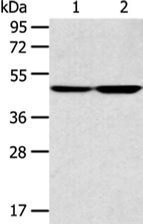 Gel: 8%SDS-PAGE, Lysate: 40 μg, Lane 1-2: A172 and 293T cell, Primary antibody: CSB-PA108827(TEKT4 Antibody) at dilution 1/200 dilution, Secondary antibody: Goat anti rabbit IgG at 1/8000 dilution, Exposure time: 1 minute