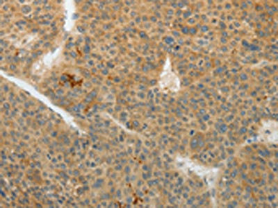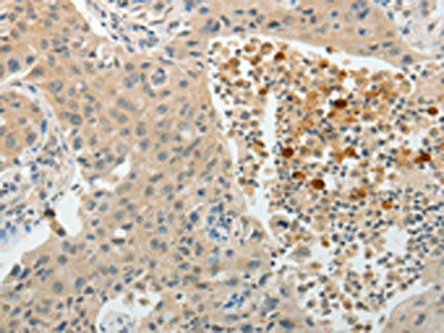 The image on the left is immunohistochemistry of paraffin-embedded Human liver cancer tissue using CSB-PA954118(TEKT5 Antibody) at dilution 1/40, on the right is treated with fusion protein. (Original magnification: ×200)