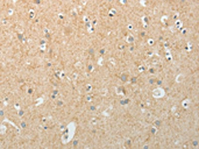 The image on the left is immunohistochemistry of paraffin-embedded Human brain tissue using CSB-PA581368(TEKT5 Antibody) at dilution 1/20, on the right is treated with fusion protein. (Original magnification: ×200)