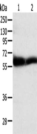 Gel: 10%SDS-PAGE, Lysate: 40 μg, Lane 1-2: Human brain malignant glioma tissue, human seminoma tissue, Primary antibody: CSB-PA581368(TEKT5 Antibody) at dilution 1/350, Secondary antibody: Goat anti rabbit IgG at 1/8000 dilution, Exposure time: 10 minutes