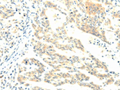 The image on the left is immunohistochemistry of paraffin-embedded Human gastric cancer tissue using CSB-PA110310(TERF1 Antibody) at dilution 1/30, on the right is treated with fusion protein. (Original magnification: ×200)