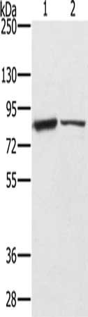 Gel: 6%SDS-PAGE, Lysate: 40 μg, Lane 1-2: Human kidney tissue, Human prostate tissue, Primary antibody: CSB-PA917773(TF Antibody) at dilution 1/200, Secondary antibody: Goat anti rabbit IgG at 1/8000 dilution, Exposure time: 20 seconds