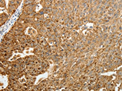 The image on the left is immunohistochemistry of paraffin-embedded Human ovarian cancer tissue using CSB-PA048054(TFF2 Antibody) at dilution 1/40, on the right is treated with fusion protein. (Original magnification: ×200)