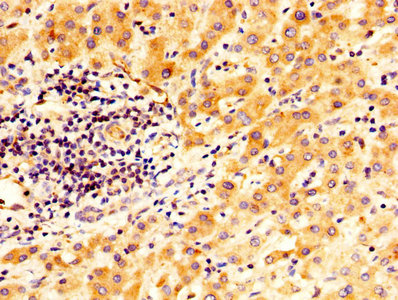 IHC image of CSB-PA11809A0Rb diluted at 1:400 and staining in paraffin-embedded human liver cancer performed on a Leica BondTM system. After dewaxing and hydration, antigen retrieval was mediated by high pressure in a citrate buffer (pH 6.0). Section was blocked with 10% normal goat serum 30min at RT. Then primary antibody (1% BSA) was incubated at 4°C overnight. The primary is detected by a biotinylated secondary antibody and visualized using an HRP conjugated SP system.