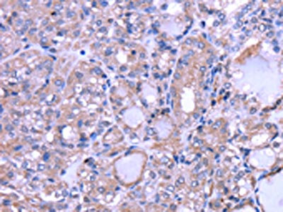The image on the left is immunohistochemistry of paraffin-embedded Human thyroid cancer tissue using CSB-PA696718(THRSP Antibody) at dilution 1/30, on the right is treated with fusion protein. (Original magnification: ×200)