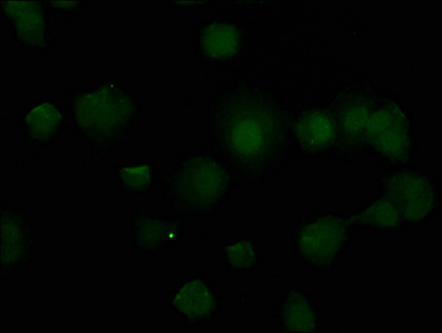 Immunofluorescence staining of MCF-7 cells with CSB-PA023529HA01HU at 1:50, counter-stained with DAPI. The cells were fixed in 4% formaldehyde, permeabilized using 0.2% Triton X-100 and blocked in 10% normal Goat Serum. The cells were then incubated with the antibody overnight at 4°C. The secondary antibody was Alexa Fluor 488-congugated AffiniPure Goat Anti-Rabbit IgG(H+L).