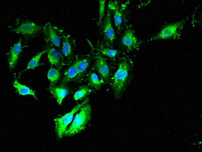 Immunofluorescent analysis of Hela cells using CSB-PA850304LA01HU at dilution of 1:100 and Alexa Fluor 488-congugated AffiniPure Goat Anti-Rabbit IgG(H+L)