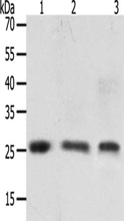 Gel: 8+12%SDS-PAGE, Lysate: 50 μg, Lane 1-3: Human brain tissue, PC3 cells, hela cells, Primary antibody: CSB-PA188746(TIMP4 Antibody) at dilution 1/200, Secondary antibody: Goat anti rabbit IgG at 1/8000 dilution, Exposure time: 30 seconds