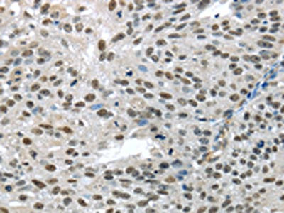 The image on the left is immunohistochemistry of paraffin-embedded Human thyroid cancer tissue using CSB-PA570820(TKT Antibody) at dilution 1/25, on the right is treated with fusion protein. (Original magnification: ×200)