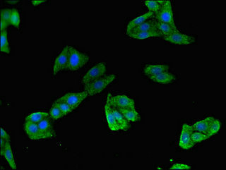 Immunofluorescent analysis of HepG2 cells using CSB-PA023604LA01HU at dilution of 1:100 and Alexa Fluor 488-congugated AffiniPure Goat Anti-Rabbit IgG(H+L)
