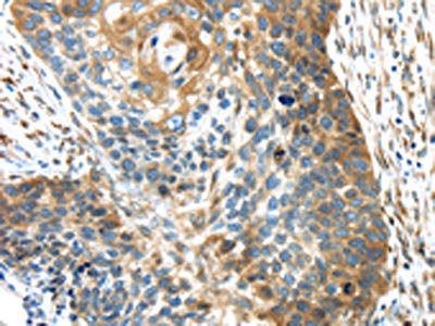 The image on the left is immunohistochemistry of paraffin-embedded Human esophagus cancer tissue using CSB-PA639635(TMED4 Antibody) at dilution 1/45, on the right is treated with fusion protein. (Original magnification: ×200)