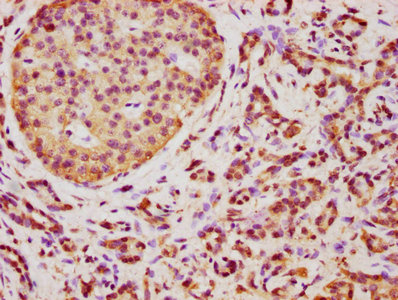 IHC image of CSB-PA023720LA01HU diluted at 1:350 and staining in paraffin-embedded human pancreatic cancer performed on a Leica BondTM system. After dewaxing and hydration, antigen retrieval was mediated by high pressure in a citrate buffer (pH 6.0). Section was blocked with 10% normal goat serum 30min at RT. Then primary antibody (1% BSA) was incubated at 4°C overnight. The primary is detected by a biotinylated secondary antibody and visualized using an HRP conjugated SP system.