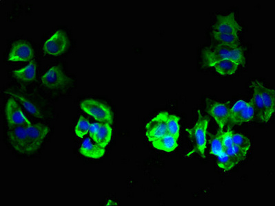 Immunofluorescent analysis of MCF-7 cells using CSB-PA023803LA01HU at dilution of 1:100 and Alexa Fluor 488-congugated AffiniPure Goat Anti-Rabbit IgG(H+L)