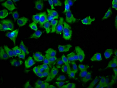 Immunofluorescence staining of MCF-7 cells with CSB-PA862028LA01HU at 1:66, counter-stained with DAPI. The cells were fixed in 4% formaldehyde, permeabilized using 0.2% Triton X-100 and blocked in 10% normal Goat Serum. The cells were then incubated with the antibody overnight at 4°C. The secondary antibody was Alexa Fluor 488-congugated AffiniPure Goat Anti-Rabbit IgG(H+L).