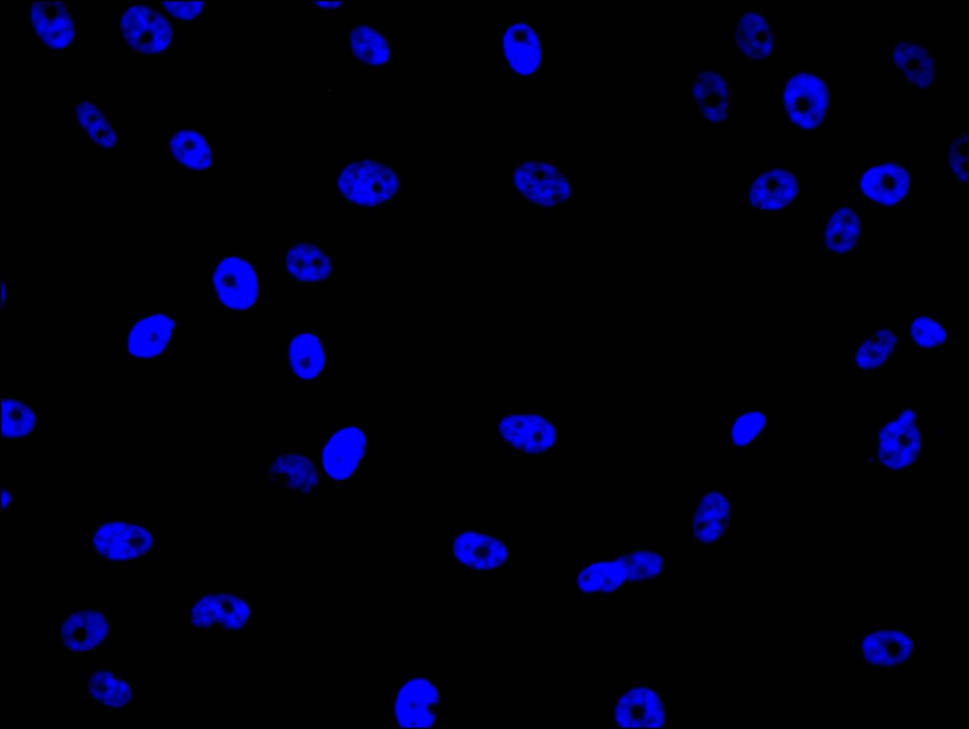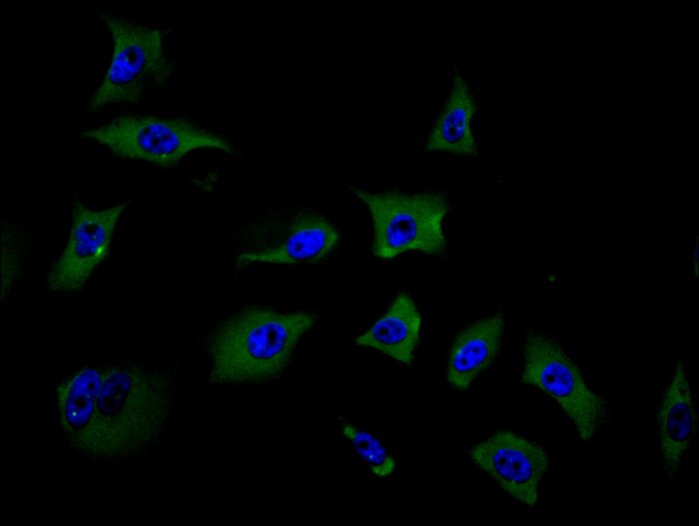 Immunofluorescence staining of HepG2 cell with 5% goat serum, counter-stained with DAPI. The cells were fixed in 4% formaldehyde and blocked in 10% normal Goat Serum. The cells were then incubated with the antibody overnight at 4C. The secondary antibody was Alexa Fluor 488-congugated AffiniPure Goat Anti-Rabbit IgG(H+L).