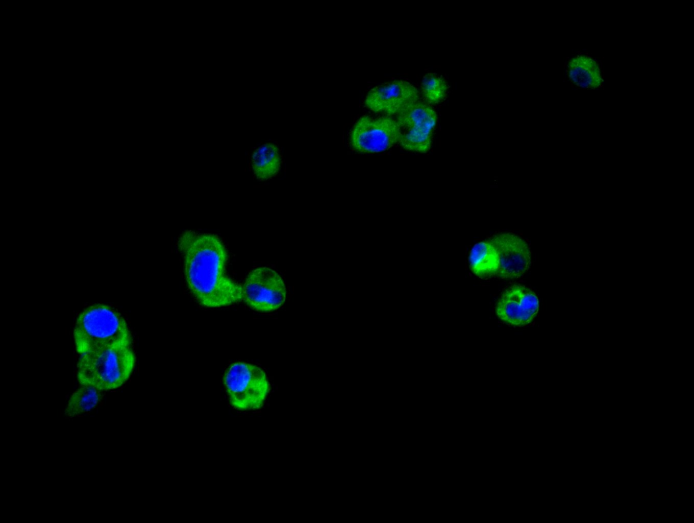 Immunofluorescence staining of PC-3 cell with CSB-PA023837LA01HU at 1:30, counter-stained with DAPI. The cells were fixed in 4% formaldehyde and blocked in 10% normal Goat Serum. The cells were then incubated with the antibody overnight at 4C. The secondary antibody was Alexa Fluor 488-congugated AffiniPure Goat Anti-Rabbit IgG(H+L).