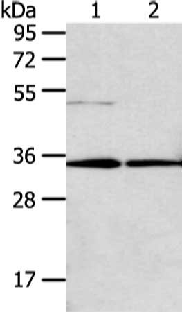 Gel: 8%SDS-PAGE, Lysate: 40 μg, Lane 1-2: Lo2 and huvec cell, Primary antibody: CSB-PA454097(TNFAIP1 Antibody) at dilution 1/200 dilution, Secondary antibody: Goat anti rabbit IgG at 1/8000 dilution, Exposure time: 40 seconds