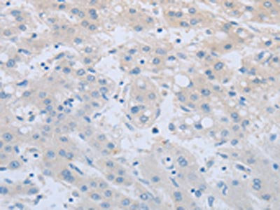 The image on the left is immunohistochemistry of paraffin-embedded Human liver cancer tissue using CSB-PA210767(TNFRSF11B Antibody) at dilution 1/20, on the right is treated with fusion protein. (Original magnification: ×200)